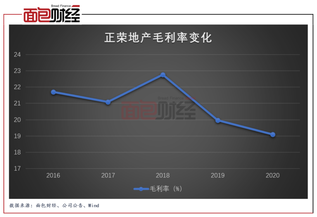 值得注意的是,正榮地產(chǎn)的毛利率在近幾年有持續(xù)下滑趨勢。2016年至2019年,公司的毛利率分別為21.7%、21.09%、22.76%、19.96%。和行業(yè)對比來看,正榮地產(chǎn)的毛利率處于較低水平。