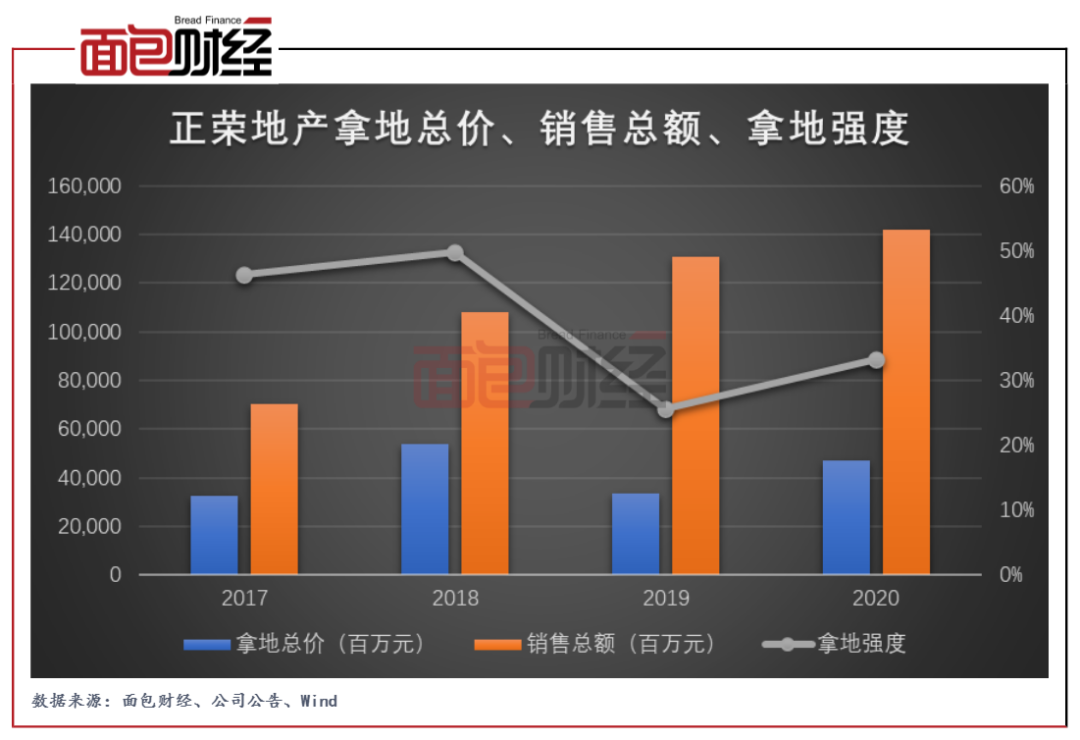 報(bào)告期內(nèi),正榮地產(chǎn)新增土地儲(chǔ)備2.5百萬平方米,同比增長約25%;拿地總價(jià)472.21億元,同比增長41.38%。拿地強(qiáng)度方面,在金額口徑下,公司2020年拿地強(qiáng)度為33.28%,同比上升7.73個(gè)百分點(diǎn)。