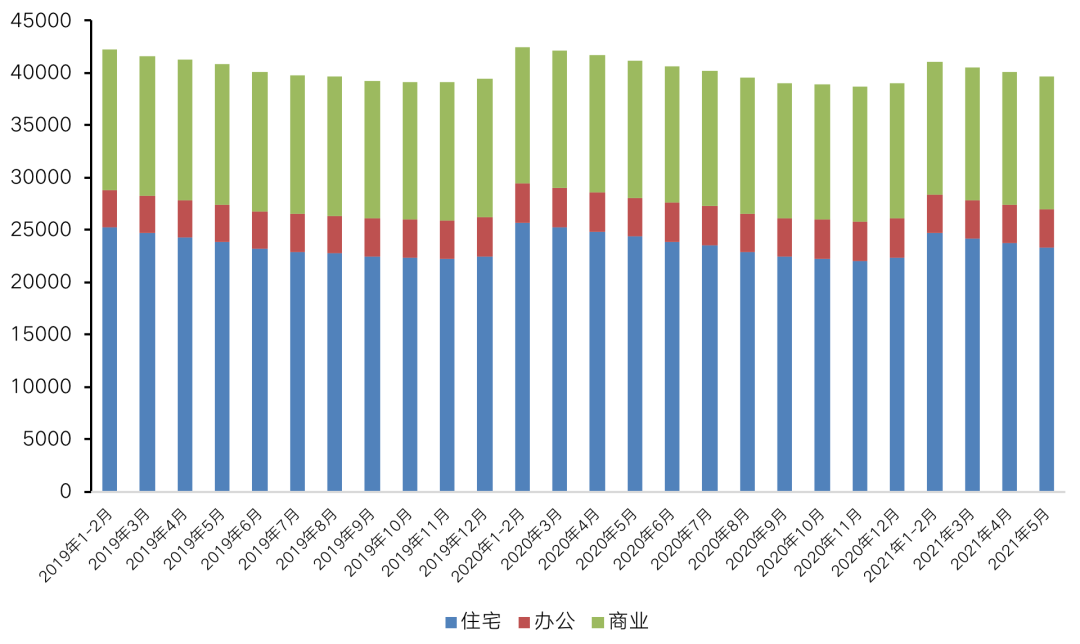具體而言,得益于市場(chǎng)成交火熱,供不應(yīng)求帶動(dòng)整體庫(kù)存回落,住宅待售面積降幅顯著,較4月減少399萬(wàn)平方米,辦公、商業(yè)待售面積降幅有限,5月較4月下降均不超20萬(wàn)平方米,整體去化壓力依舊較大。