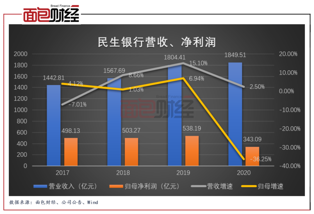 從業(yè)績來看,2020年民生銀行實現(xiàn)營業(yè)收入1849.51億元,同比上升2.5%;由于2020年該行計提大量信用減值損失,導致其歸母凈利潤銳減195.1億元。