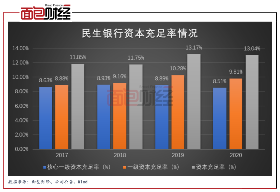 數(shù)據(jù)顯示,截至2020年末,民生銀行的資本充足率為13.04%,較上年末下降0.13個百分點;核心一級資本充足率、一級資本充足率分別為8.51%、9.81%,較上年末下降0.38、0.47個百分點。