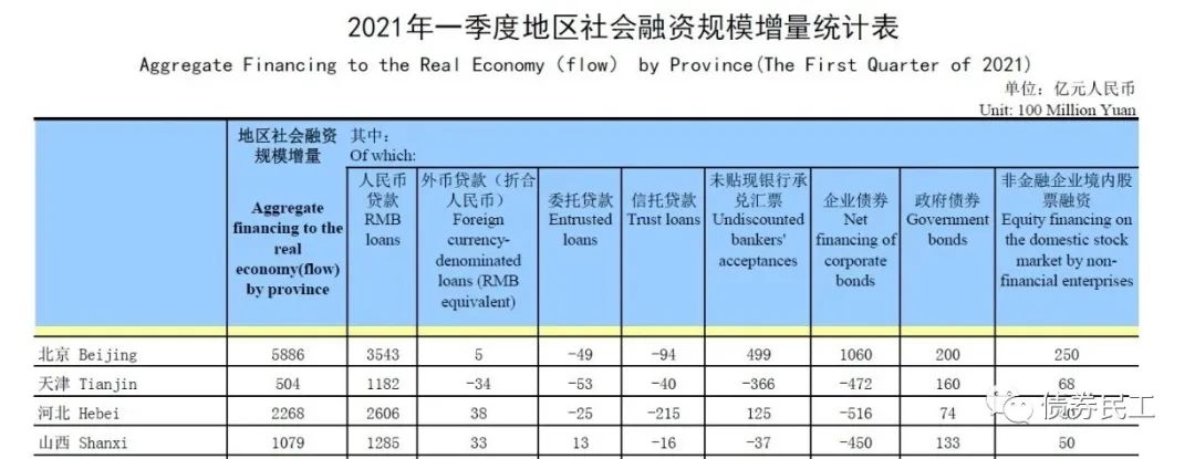 1、根據(jù)中國(guó)人民銀行2021年一季度地區(qū)社會(huì)融資規(guī)模增量統(tǒng)計(jì)表,河北省的企業(yè)債券融資金額為-516億元,位列全國(guó)倒數(shù)第一,這個(gè)金額比引發(fā)信用債券市場(chǎng)大波動(dòng)的永煤事件所在的河南(-271億元)、華晨集團(tuán)所在的遼寧(-295億元)還要低。在沒有出現(xiàn)重大信用債券負(fù)面輿情的情況下,這個(gè)數(shù)據(jù)真的是讓人震驚了。