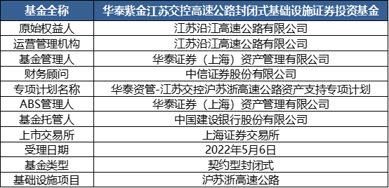 2022年5月6日,江蘇沿江高速公路有限公司作為原始權(quán)益人的“華泰紫金江蘇交控高速公路封閉式基礎(chǔ)設(shè)施證券投資基金”在上交所已受理!基礎(chǔ)設(shè)施項(xiàng)目類型為收費(fèi)公路,項(xiàng)目名稱為滬蘇浙高速公路,高速公路收費(fèi)經(jīng)營(yíng)權(quán)及相關(guān)資產(chǎn)組評(píng)估價(jià)值為295,110.00萬(wàn)元,剩余年限約10.5年。本期產(chǎn)品基金管理人和ABS管理人為華泰證券(上海)資產(chǎn)管理有限公司,財(cái)務(wù)顧問(wèn)為中信證券股份有限公司,托管行為中國(guó)建設(shè)銀行股份有限公司,原始權(quán)益人的控股股東為江蘇交通控股有限公司。