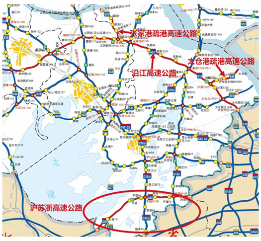 沿江高速公司的核心資產(chǎn)包括滬武高速公路(常州至太倉(cāng)段)(簡(jiǎn)稱“沿江高速公路”)、滬蘇浙高速公路、太倉(cāng)港疏港高速公路和張家港疏港高速公路,所轄路段總里程超220公里。其中,沿江高速公路是江蘇省“七縱十橫十聯(lián)”高速公路網(wǎng)布局主骨架網(wǎng)(2017-2030年規(guī)劃)的重要組成部分,全長(zhǎng)138.62公里,匝道約64公里,是江蘇省與上海市的主要出入通道之一,具有獨(dú)特的地域優(yōu)勢(shì)。