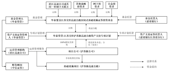 本基金通過(guò)基礎(chǔ)設(shè)施資產(chǎn)支持證券與項(xiàng)目公司特殊目的載體穿透取得基礎(chǔ)設(shè)施項(xiàng)目的所有權(quán)。本基金的基金管理人和資產(chǎn)支持證券管理人為華泰證券(上海)資產(chǎn)管理有限公司,本基金的托管人為中國(guó)建設(shè)銀行股份有限公司。基金管理人聘請(qǐng)江蘇沿江高速公路有限公司擔(dān)任運(yùn)營(yíng)管理機(jī)構(gòu),負(fù)責(zé)基礎(chǔ)設(shè)施項(xiàng)目的運(yùn)營(yíng)管理工作。上述基礎(chǔ)設(shè)施基金的整體架構(gòu)符合《公開(kāi)募集基礎(chǔ)設(shè)施證券投資基金指引(試行)》的規(guī)定。本基金的整體架構(gòu)如下圖所示: