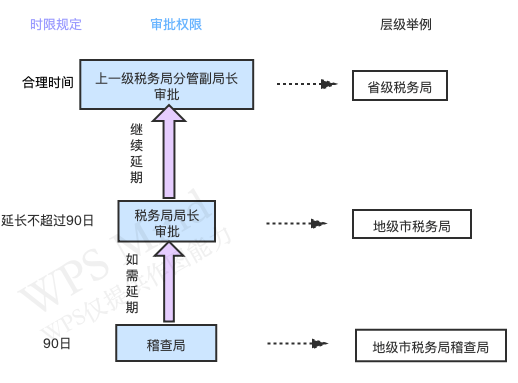 “稽查局應(yīng)當(dāng)自立案之日起90日內(nèi)作出行政處理、處罰決定或者無稅收違法行為結(jié)論。案情復(fù)雜需要延期的,經(jīng)稅務(wù)局局長批準(zhǔn),可以延長不超過90日;特殊情況或者發(fā)生不可抗力需要繼續(xù)延期的,應(yīng)當(dāng)經(jīng)上一級(jí)稅務(wù)局分管副局長批準(zhǔn),并確定合理的延長期限。”