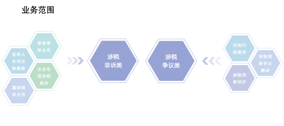 涉稅非訴業(yè)務(wù)主要涉及咨詢審核業(yè)務(wù),企業(yè)專項(xiàng)涉稅服務(wù)、自然人專項(xiàng)涉稅服務(wù)以及國際稅收業(yè)務(wù);涉稅爭議業(yè)務(wù)主要涉及涉稅行政救濟(jì)、刑事辯護(hù)以及民事涉稅爭議解決。
