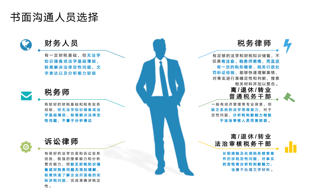 從上圖對(duì)比可看出,擁有注冊會(huì)計(jì)師、稅務(wù)師資格且有一定稅務(wù)稽查應(yīng)對(duì)、稅務(wù)行政處罰聽證經(jīng)驗(yàn)的稅務(wù)律師和長期在法治審核崗工作的離/退休/轉(zhuǎn)業(yè)稅務(wù)干部會(huì)是書面溝通的最佳人選,他們通常具備上述四項(xiàng)能力,能較好地處理事實(shí)到定性轉(zhuǎn)化的過程。