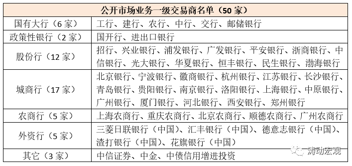 央行會在每年的4月底公布最新年度的公開市場業(yè)務(wù)一級交易商名單。最新的公開市場業(yè)務(wù)一級交易商名單有50家