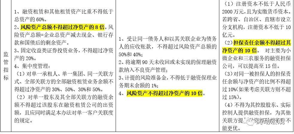 (2)此外為限制風(fēng)險的集中,政策還在業(yè)務(wù)集中度給予了明確限制。具體來看,對融資租賃公司,要求對單一承租人、單一集團(tuán)、同一關(guān)聯(lián)方式、全部關(guān)聯(lián)方的全部融資租賃業(yè)務(wù)余額;對商業(yè)保理公司,要求受讓同一債務(wù)人和以其關(guān)聯(lián)企業(yè)為債務(wù)人的應(yīng)收賬款,不得超過風(fēng)險資產(chǎn)總額的50%和40%;對融資擔(dān)保公司,要求對同一被擔(dān)保人的擔(dān)保責(zé)任余額與凈資產(chǎn)的比例不得超過10%(如果考慮關(guān)聯(lián)方則不超過15%)。