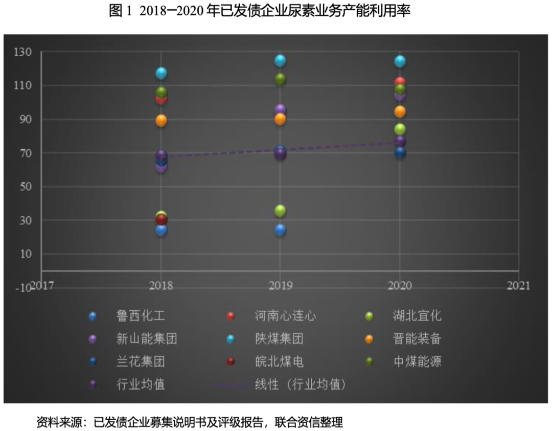 通過下圖已發(fā)債尿素企業(yè)的產(chǎn)能利用率分布可以看出,2018年,魯西化工、湖北宜化、新山能集團(tuán)、山西蘭花煤炭實(shí)業(yè)集團(tuán)有限公司(以下簡(jiǎn)稱“蘭花集團(tuán)”)和安徽省皖北煤電集團(tuán)有限責(zé)任公司(以下簡(jiǎn)稱“皖北煤電”)尿素產(chǎn)能利用率均低于行業(yè)均值。皖北煤電的子公司安徽淮化集團(tuán)有限公司已于2018年停產(chǎn)整頓,后期不再生產(chǎn)尿素。