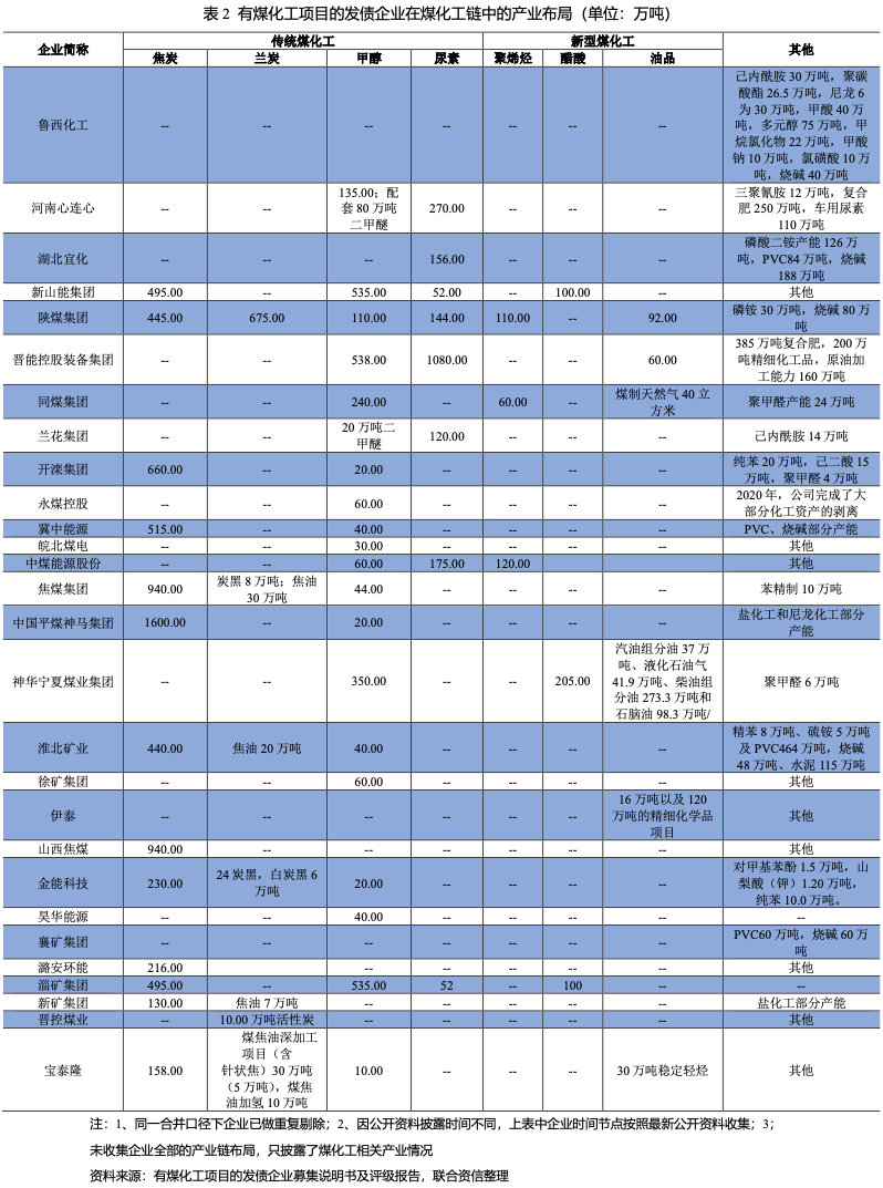 目前公開市場(chǎng)上有煤化工項(xiàng)目的發(fā)債企業(yè)主要有大型煤炭企業(yè)向煤化工產(chǎn)業(yè)鏈延伸以及少數(shù)無煤炭資源的化工企業(yè),以大型煤炭企業(yè)為主。通過對(duì)已發(fā)債煤化工項(xiàng)目的企業(yè)產(chǎn)業(yè)布局統(tǒng)計(jì)發(fā)現(xiàn):煤化工產(chǎn)業(yè)布局主要以傳統(tǒng)煤化工為主,其中焦炭產(chǎn)能合計(jì)7264萬噸,蘭炭675萬噸,甲醇2887萬噸(部分作為中間產(chǎn)品下游部分配套聚烯烴產(chǎn)業(yè)),尿素2049萬噸。部分企業(yè)配套煤焦油、粗苯加氫精制、二甲醚等產(chǎn)能。新型煤化工產(chǎn)業(yè)布局較少,其中聚烯烴合計(jì)產(chǎn)能290萬噸,主要分布在晉能控股煤業(yè)集團(tuán)有限公司(原“同煤集團(tuán)”)、陜西煤業(yè)化工集團(tuán)有限責(zé)任公司(以下簡(jiǎn)稱“陜煤集團(tuán)”)、中國(guó)中煤能源股份有限公司(以下簡(jiǎn)稱“中煤能源”);醋酸產(chǎn)能合計(jì)405萬噸,主要分布在山東能源集團(tuán)有限公司(以下簡(jiǎn)稱“新山能集團(tuán)”)、國(guó)家能源集團(tuán)寧夏煤業(yè)有限責(zé)任公司和淄博礦業(yè)集團(tuán)有限責(zé)任公司。由于煤制天然氣、煤制油的煤油價(jià)格盈虧平衡點(diǎn)較高,該部分業(yè)務(wù)產(chǎn)能較少,如內(nèi)蒙古伊泰集團(tuán)有限公司等部分企業(yè)前期規(guī)劃的在建項(xiàng)目也已暫停。