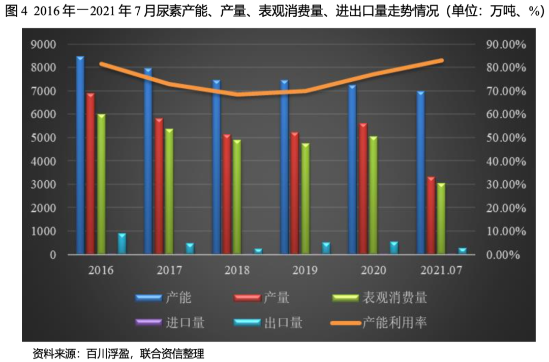 近年來,隨著環(huán)保約束趨嚴(yán)和市場(chǎng)化出清,尿素行業(yè)落后產(chǎn)能逐步被淘汰退出市場(chǎng),同時(shí)采用先進(jìn)工藝的裝置陸續(xù)投產(chǎn),行業(yè)整體產(chǎn)能穩(wěn)中有降。2016-2020年,我國(guó)尿素行業(yè)年均復(fù)合下降7.62%,其中,煤頭尿素年均復(fù)合下降5.42%,氣頭尿素年均復(fù)合下降2.19%。2021年,我國(guó)尿素產(chǎn)能合計(jì)6976萬噸,有效產(chǎn)能合計(jì)6355萬噸。受益于落后產(chǎn)能的逐步出清,尿素行業(yè)產(chǎn)能利用率從2019年逐年回升,2021年7月產(chǎn)能利用率為83.15%,已處于近5年最高水平。