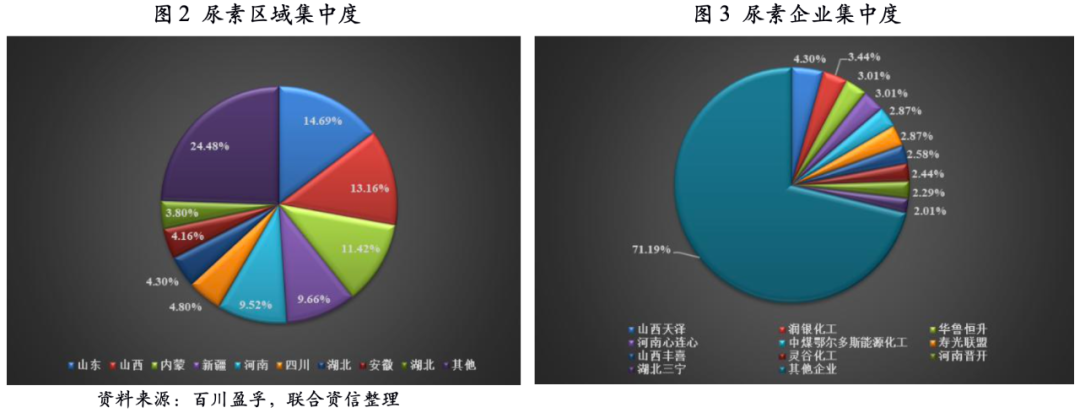 從區(qū)域集中度來看,山東、山西、內(nèi)蒙產(chǎn)能占比靠前,占比分別為14.69%、13.16%和11.42%,但整體較為分散。從企業(yè)集中度來看,前十大企業(yè)產(chǎn)能合計(jì)占比28.81%,排名靠前的企業(yè)分別為山西天澤煤化工集團(tuán)股份公司、山東潤(rùn)銀生物化工股份有限公司和山東華魯恒升化工股份有限公司(以下簡(jiǎn)稱“華魯恒升”),占比分別為4.30%、3.44%和3.01%。整體看,尿素行業(yè)集中度較低。