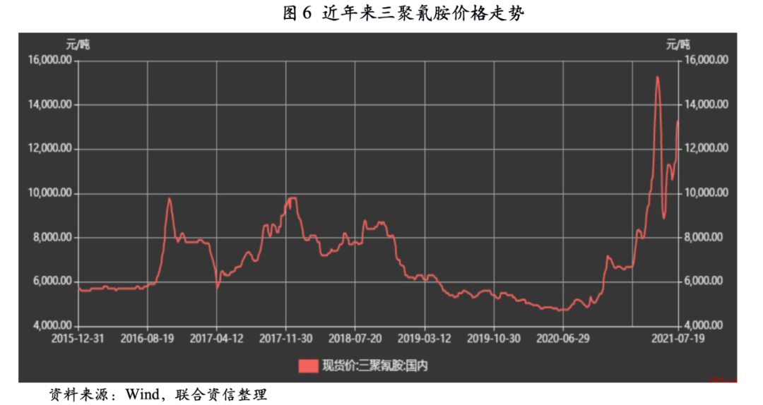 三聚氰胺方面,生產(chǎn)一噸三聚氰胺大約需要3噸尿素,三聚氰胺產(chǎn)量已由2016年的96.68萬噸增長(zhǎng)至2020年的133.25萬噸,年均復(fù)合增長(zhǎng)8.35%。目前三聚氰胺價(jià)格較高,單噸利潤(rùn)較好,三聚氰胺整體開工率較高。2021年三聚氰胺有效產(chǎn)能為168.50萬噸,若產(chǎn)能完全釋放將帶動(dòng)尿素需求較2020年增加約100萬噸。