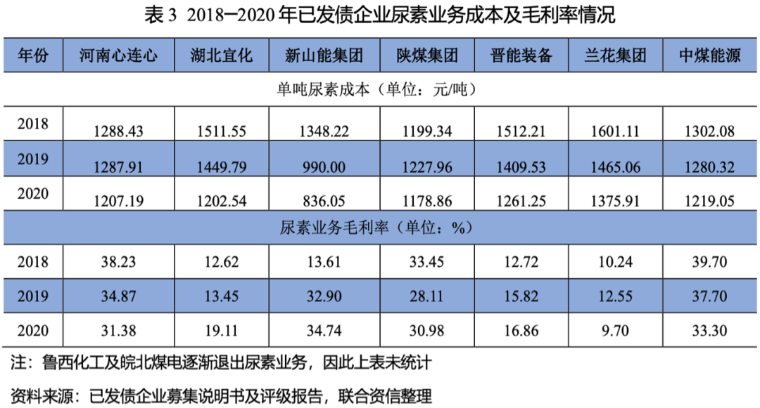 已發(fā)債企業(yè)中尿素產(chǎn)品毛利率相差較大,主要系生產(chǎn)工藝、裝置規(guī)模、原材料獲取能力、是否產(chǎn)生協(xié)同效應(yīng)等原因所致。