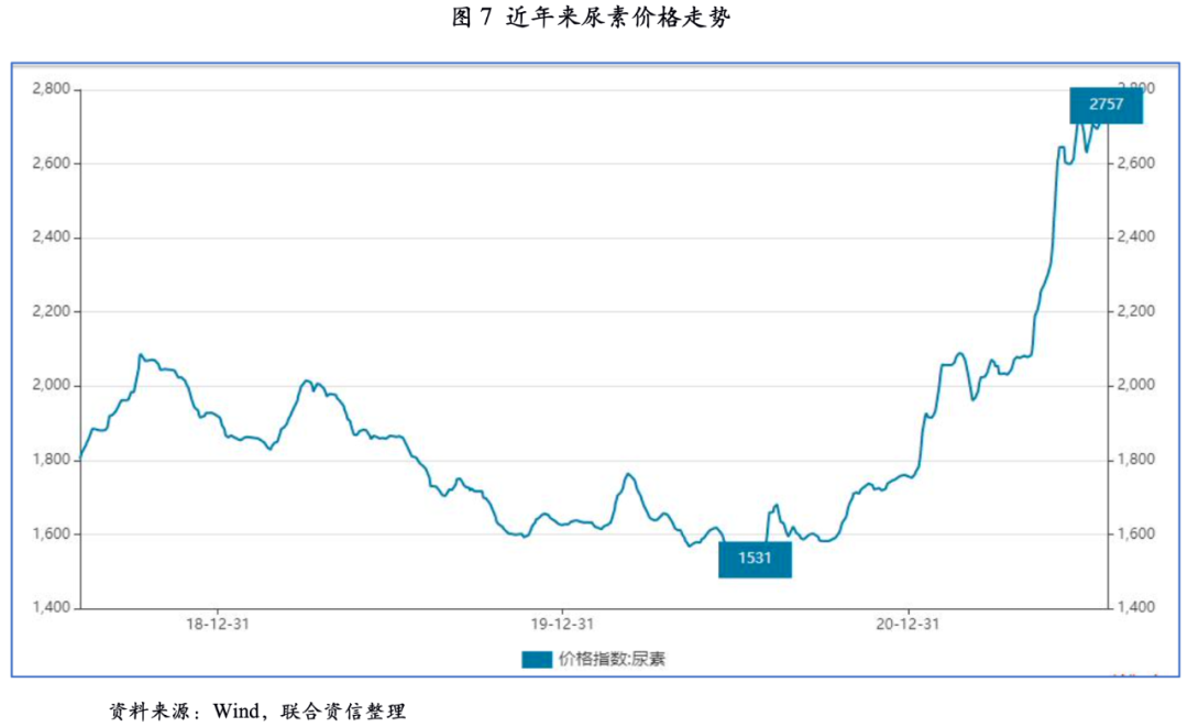 但受全球疫情持續(xù)爆發(fā)影響,尿素出口減少,尿素市場(chǎng)供大于求導(dǎo)致4月份開始價(jià)格下降并于2020年7月底達(dá)到最低點(diǎn)。隨后尿素價(jià)格在印度招標(biāo)、行業(yè)檢修和環(huán)保限產(chǎn)以及工業(yè)用肥需求增長(zhǎng)等因素的帶動(dòng)下開啟了快速上漲模式,2021年5月后期,由于上游無煙煤價(jià)格大幅上漲導(dǎo)致尿素價(jià)格大幅攀升,目前尿素價(jià)格屬于歷史高位。未來,尿素農(nóng)業(yè)需求及工業(yè)需求有望提高;同時(shí)若尿素固定床裝置淘汰政策落實(shí)到位,尿素供給將會(huì)收縮,產(chǎn)品價(jià)格有望得到支撐。