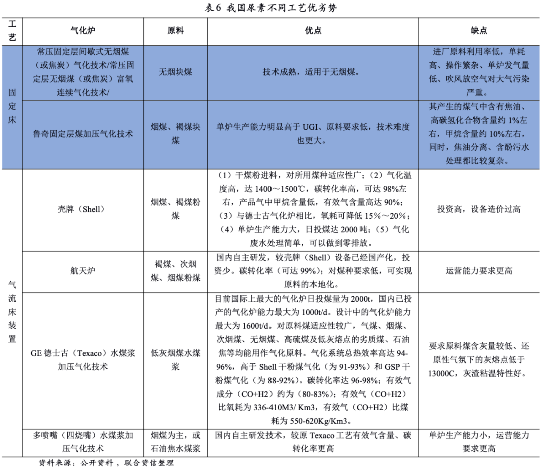 當(dāng)前煤制尿素煤化工生產(chǎn)裝置主要分為兩類,一種是固定床裝置,一種是氣流床裝置。其中氣流床從進(jìn)料方式上又可以分為干法(干粉進(jìn)料)和濕法(水煤漿進(jìn)料)。干法氣化裝置目前在國(guó)內(nèi)應(yīng)用較多的主要有殼牌(Shell)和航天爐;濕法氣化裝置目前在國(guó)內(nèi)應(yīng)用較多的有GE德士古(Texaco)、四噴嘴等,這些氣化爐在原材料、能耗、碳轉(zhuǎn)化率、投資規(guī)模等各方面均不同,具體優(yōu)劣勢(shì)如下表所示。