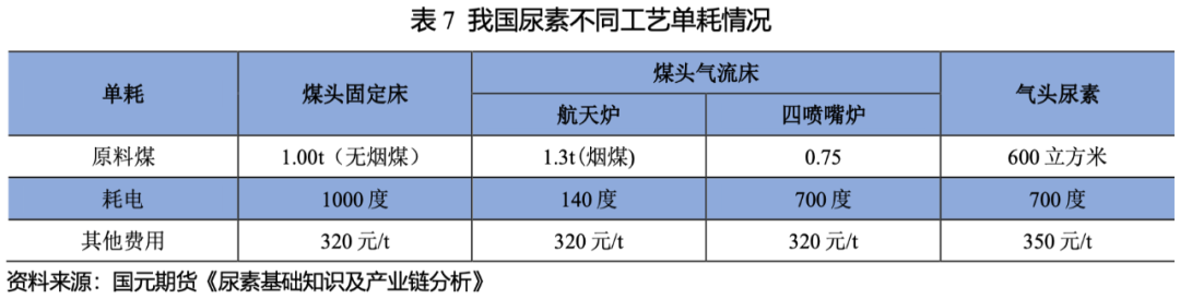 在無煙煤為原料的裝置下,生產(chǎn)1噸尿素,需消耗無煙煤1噸左右,100公斤左右的動(dòng)力煤,1000度左右的電。在煙煤原料的裝置下,航天爐裝置消耗的煙煤為1.3~1.5噸,耗電量140~200度電;四噴嘴氣化爐裝置消耗的煙煤為0.75~0.79噸,耗電量控制在700~1000度電。氣頭尿素的生產(chǎn)成本主要由天然氣價(jià)格、電費(fèi)和加工費(fèi)組成,生產(chǎn)1噸尿素需消耗600~800立方米天然氣。