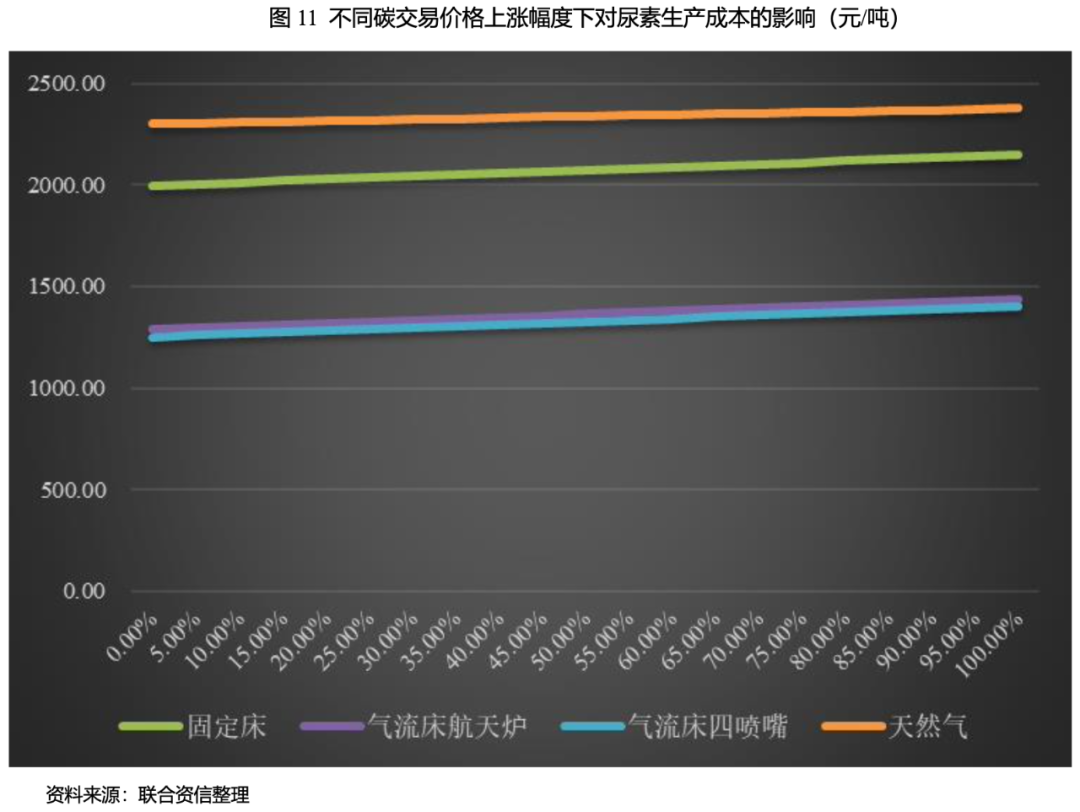 假設(shè)在其他期間費(fèi)用、原材料價(jià)格(煙煤、無煙煤及天然氣基礎(chǔ)價(jià)格采用2016年以來的市場(chǎng)平均價(jià)格,分別為576.38元/噸、1027.92元/噸和2.54元/立方米)以及電價(jià)為0.5元/度不變,在碳交易起始價(jià)格50元/噸(自7月份全國(guó)碳市場(chǎng)交易啟動(dòng)以來,全國(guó)碳配額價(jià)格一直維持在50元/噸以上,期間最高價(jià)曾超過60元/每噸,因此下文假設(shè)碳交易成本為50元/噸作為起始成本),不同工藝下尿素的生產(chǎn)成本上漲幅度如下表所示。同時(shí),通過不同碳交易價(jià)格測(cè)算出不同工藝的生產(chǎn)成本如下圖所示。通過測(cè)算可以看出天然氣對(duì)碳交易價(jià)格的敏感性最高,固定床裝置對(duì)碳交易價(jià)格的敏感性最低。雖然煤頭尿素的碳排放量遠(yuǎn)高于氣頭尿素,但碳交易后煤頭尿素企業(yè)的單噸生產(chǎn)成本仍低于氣頭尿素。整體看,碳交易成本對(duì)尿素生產(chǎn)成本的敏感性較低。
