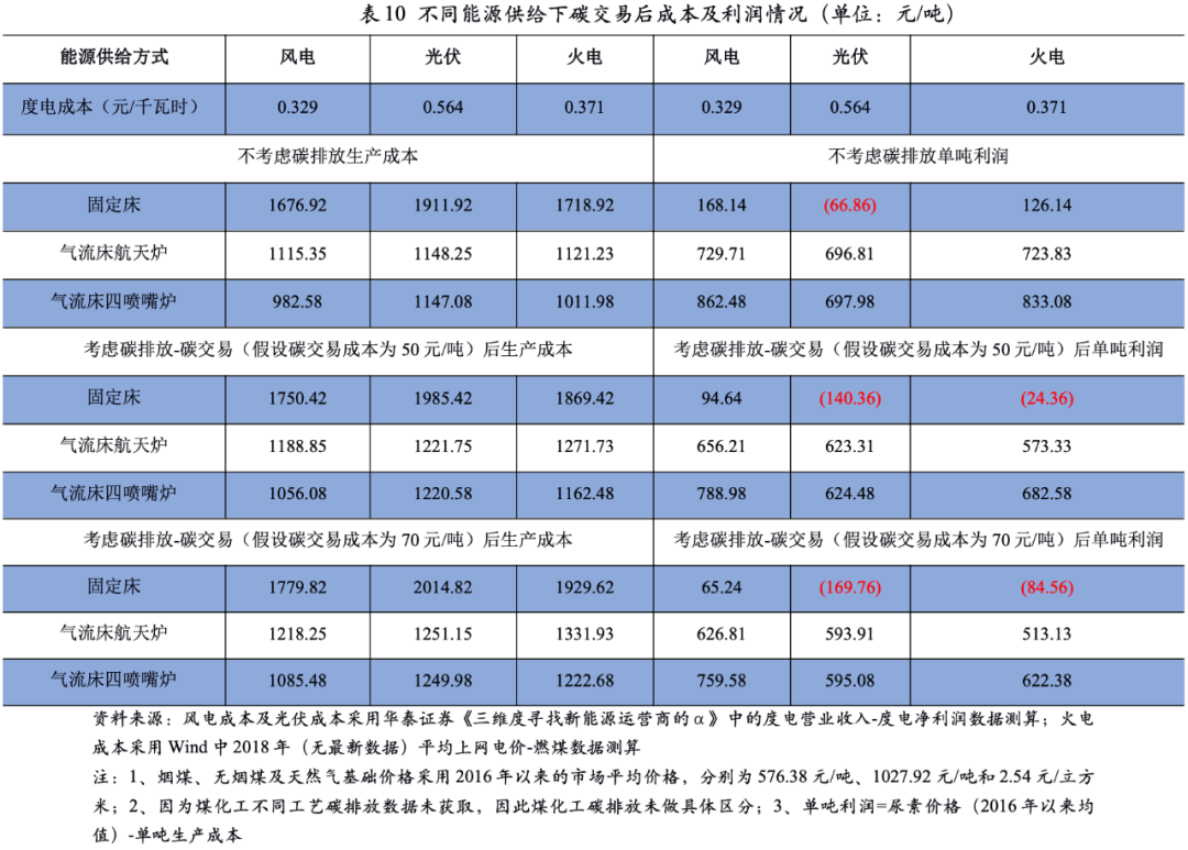 當(dāng)前我國(guó)電力供給主要有光伏、風(fēng)電、火電及核電,下文假設(shè)尿素生產(chǎn)過程中電力及熱能主要通過光伏、風(fēng)電、火電三種方式自供。風(fēng)電及光伏自供的度電成本采用市場(chǎng)上風(fēng)電或光伏企業(yè)2016-2020年的度電營(yíng)業(yè)收入–度電凈利潤(rùn)平均值測(cè)算,火電自供的度電成本采取上網(wǎng)電價(jià)測(cè)算。同時(shí),光伏及風(fēng)電作為清潔能源,在能耗產(chǎn)生過程中的碳排放量為零;進(jìn)而考慮在碳交易(假設(shè)碳交易成本為50元/噸)的背景下,測(cè)算不同能源供應(yīng)下碳交易后成本及利潤(rùn)情況。從下表可以看出,風(fēng)電的度電成本較低,不同工藝下均具有成本優(yōu)勢(shì),其中氣流床四噴嘴爐裝置的生產(chǎn)成本最低。光伏因?yàn)槎入姵杀据^高,不同工藝下生產(chǎn)成本均高于火電及風(fēng)電的能源供應(yīng)方式;而氣流床航天爐裝置和氣流床四噴嘴爐裝置的生產(chǎn)成本相當(dāng)。在考慮碳排放-碳交易后可以看出,風(fēng)電作為能源供應(yīng)的方式成本優(yōu)勢(shì)更為明顯。光伏作為能源供應(yīng)的方式下,氣流床航天爐裝置的成本優(yōu)勢(shì)大于火電,其他工藝仍然不及火電;但是隨著碳交易成本提升,光伏作為能源供應(yīng)的方式成本優(yōu)勢(shì)均大于火電。整體看,風(fēng)電基于其較低的度電成本及清潔性導(dǎo)致碳排放量較少進(jìn)而具有很大的優(yōu)勢(shì),但是尿素企業(yè)就地獲取風(fēng)電資源的難度較大。光伏資源清潔性較好,但度電生產(chǎn)成本較高,在碳交易價(jià)格低于70元/噸時(shí),優(yōu)勢(shì)不太明顯。但是未來隨著碳排放指標(biāo)的逐步收緊,碳交易價(jià)格或?qū)⒊掷m(xù)提升,光伏作為清潔能源將替代火電資源成為尿素企業(yè)的主要能源供應(yīng)來源。
