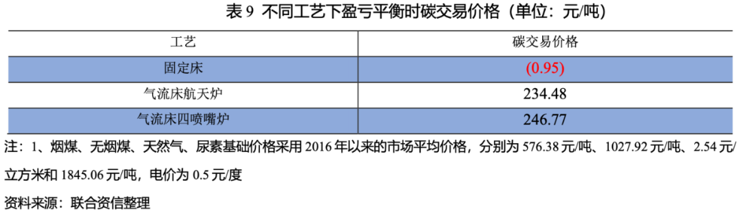 通過上文測(cè)算發(fā)現(xiàn)原材料價(jià)格變動(dòng)對(duì)尿素的生產(chǎn)成本影響很大,因此不同原材料價(jià)格下碳交易后能否實(shí)現(xiàn)盈利至關(guān)重要。下圖選取2016年以來不同原料的歷史數(shù)據(jù)以及尿素價(jià)格的歷史數(shù)據(jù),通過尿素碳交易后單噸利潤(rùn)公式(碳交易后單噸利潤(rùn)=尿素價(jià)格–尿素成本–碳交易成本)測(cè)算可以看出氣頭尿素利潤(rùn)<煤頭固定床裝置利潤(rùn)<煤頭氣流床裝置利潤(rùn),雖然煤頭尿素的碳排放量遠(yuǎn)高于氣頭尿素,但煤頭尿素企業(yè)的單噸利潤(rùn)仍高3于氣頭尿素,主要系我國(guó)天然氣資源緊張,氣頭尿素的原料成本較高所致。同時(shí),煤頭氣流床工藝基本均實(shí)現(xiàn)了盈利,氣流床航天爐裝置和氣流床四噴嘴爐裝置的單噸利潤(rùn)差距不大,天然氣及固定床工藝產(chǎn)生虧損的可能性很大。因此,煤頭氣流床工藝在碳交易后優(yōu)勢(shì)顯著,其中氣流床航天爐裝置和氣流床四噴嘴爐裝置的優(yōu)勢(shì)相當(dāng)。整體看,雖然煤頭尿素的碳排放量遠(yuǎn)高于氣頭尿素,但碳交易后煤頭尿素企業(yè)的單噸利潤(rùn)仍高于氣頭尿素,采用煤頭氣流床工藝的企業(yè)更具優(yōu)勢(shì)。在當(dāng)前碳交易價(jià)格下,煤頭氣流床尿素單噸利潤(rùn)仍較好,尿素企業(yè)的減碳動(dòng)力不足。
