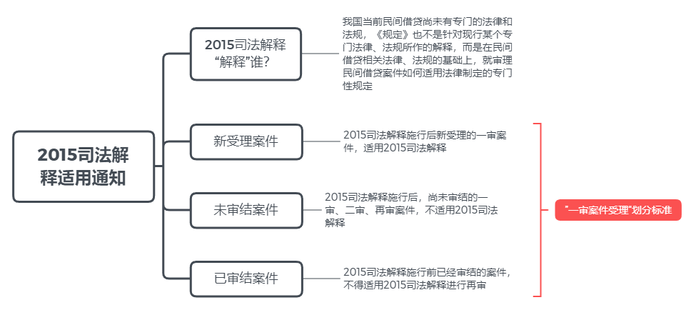 回到3808判決本身,按照8.20司法解釋第三十三條第一款“本規(guī)定施行后,人民法院新受理的一審民間借貸糾紛案件,適用本規(guī)定”,只有2020年8月20日以后新受理的一審民間借貸糾紛適用新規(guī),才能按照8.20司法解釋劃定的四倍LPR利率司法保護(hù)上限進(jìn)行裁判。當(dāng)年2015年版本的民間借貸司法解釋(下稱“2015司法解釋”)發(fā)布后,同樣遇到了溯及力問題的探討和分歧,最高法院在2015年8月25日發(fā)布了《關(guān)于認(rèn)真學(xué)習(xí)貫徹適用<最高人民法院關(guān)于審理民間借貸案件適用法律若干問題的規(guī)定>的通知》,拎一下重點(diǎn)如下: