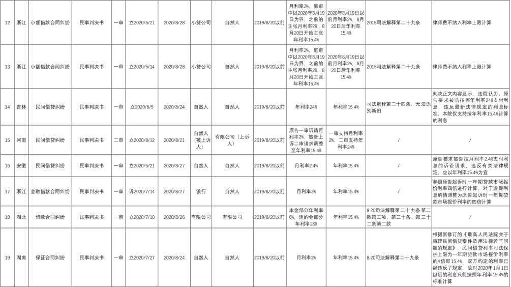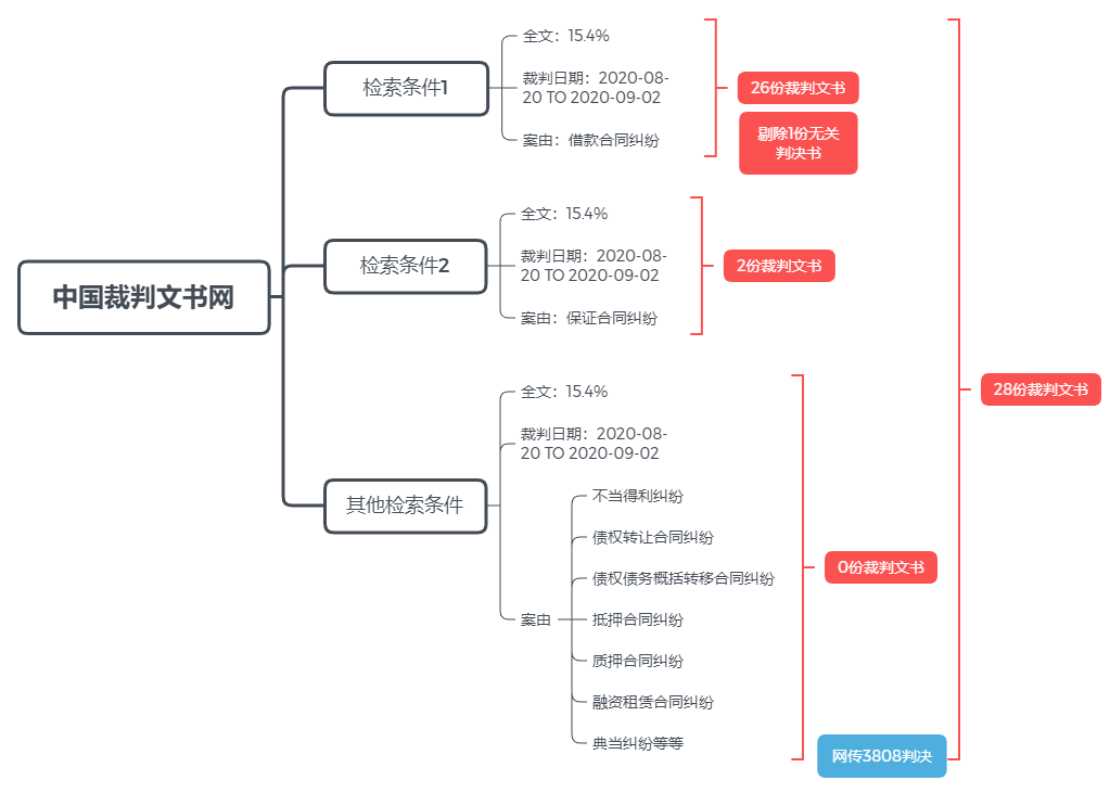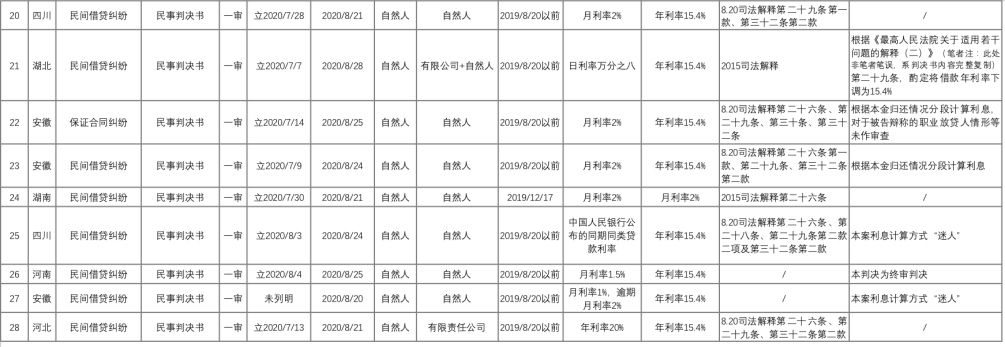好奇心驅(qū)使下,我們通過“中國裁判文書網(wǎng)”,以“全文:15.4%”“裁判日期:2020-08-20 TO 2020-09-02”以及相關(guān)案由名稱為檢索條件,進(jìn)行了“地毯式”案例檢索,獲得了28份裁判文書。在剔除一份與“四倍LPR”不相關(guān)判決書,以及加入3808判決后,我們形成了28份裁判文書作為研究樣本。