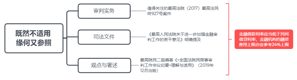 這里首先需要關(guān)注的是,對(duì)金融機(jī)構(gòu)的排除適用情形是有所限縮的,即僅限于具有發(fā)放貸款業(yè)務(wù)資質(zhì)的金融機(jī)構(gòu)且貸款類型僅限于經(jīng)營性的貸款業(yè)務(wù)。但即便如此,仍然囊括了絕大部分的金融機(jī)構(gòu)貸款業(yè)務(wù)。回歸核心問題:既然不適用,緣何又參照?