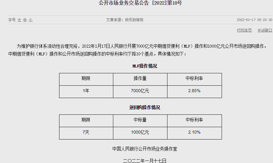 2022年1月17日,央行7000億元1年期MLF(中期借貸便利)操作,利率2.85%,此前為2.95%;同日進行1000億元7天期逆回購操作,中標利率2.1%,從原來的2.2%下調(diào)10個基點。