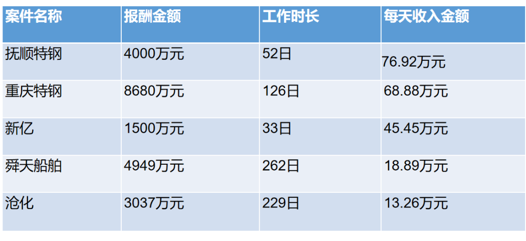 但上述破產(chǎn)案件都是上市公司重整案件,自身存在較高的重整價(jià)值,屬于破產(chǎn)案件中的優(yōu)質(zhì)資源(最終清償?shù)呢?cái)產(chǎn)價(jià)值高),而上述上市公司都在不同程度存在退市風(fēng)險(xiǎn),必須在指定時(shí)間內(nèi)退出破產(chǎn)程序,所以所耗時(shí)間較短。優(yōu)質(zhì)案件資源加上時(shí)間短,自然體現(xiàn)在單位時(shí)間內(nèi)的收費(fèi)高,但這些案件只是少數(shù)案件,而且基本上被頭部律師事務(wù)所中的破產(chǎn)團(tuán)隊(duì)所壟斷,所以不能體現(xiàn)出破產(chǎn)從業(yè)者的整體狀況。