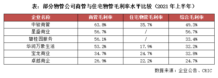 另外相較于傳統(tǒng)住宅物管,商管的盈利優(yōu)勢更加突出,這也是該業(yè)態(tài)具備吸引力的另一主要原因。商管的高盈利性主要體現(xiàn)在兩點(diǎn):一是,商業(yè)物業(yè)平均物業(yè)管理費(fèi)普遍高于住宅物業(yè)。根據(jù)保利物業(yè)中期報(bào)告披露,2021年上半年保利物業(yè)的商業(yè)及寫字樓平均物業(yè)管理費(fèi)7.66元/平方米/月,而住宅社區(qū)的平均物業(yè)管理費(fèi)僅為2.23元/平方米/月。商業(yè)物業(yè)不僅平均物業(yè)管理費(fèi)更高,且在市場較好的時(shí)候運(yùn)營管理方具備更強(qiáng)的議價(jià)能力,最終都將作用到物業(yè)收入的提升上,為企業(yè)帶來更高的績效。