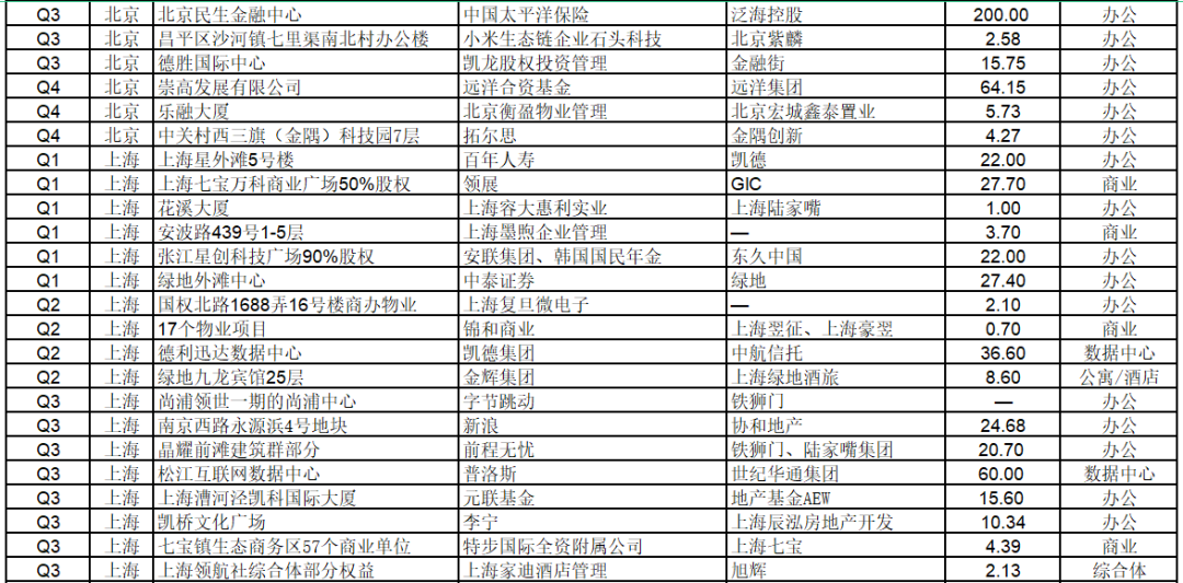 工業(yè)物業(yè)成交錄得大幅提升,占比15%,尤其是錄得多筆物流資產(chǎn)包交易。受益于在線新經(jīng)濟(jì)而加速發(fā)展的數(shù)據(jù)中心連續(xù)三個(gè)季度錄得成交。