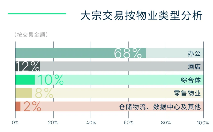 綜合體交易成為年內(nèi)第二大需求成交類型,成交額主要來自某資產(chǎn)包,該資產(chǎn)包的標(biāo)的物業(yè)為一個(gè)城市綜合體,涵蓋寫字樓、酒店、商業(yè)和公寓,總成交金額高達(dá)人民幣66億元。
