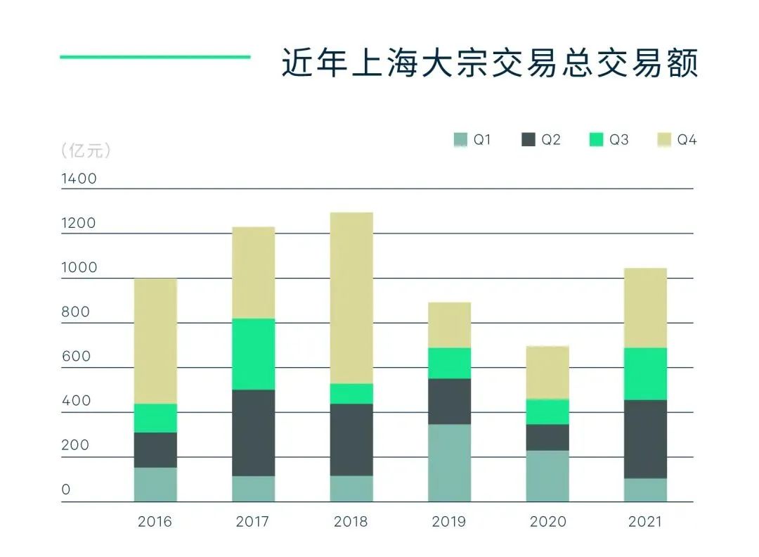 據(jù)世邦魏理仕數(shù)據(jù)顯示,2021年上海大宗交易市場(chǎng)共錄得交易89筆,全年交易總額重返千億量級(jí),達(dá)人民幣1,044.3億元,同比上漲51.3%。