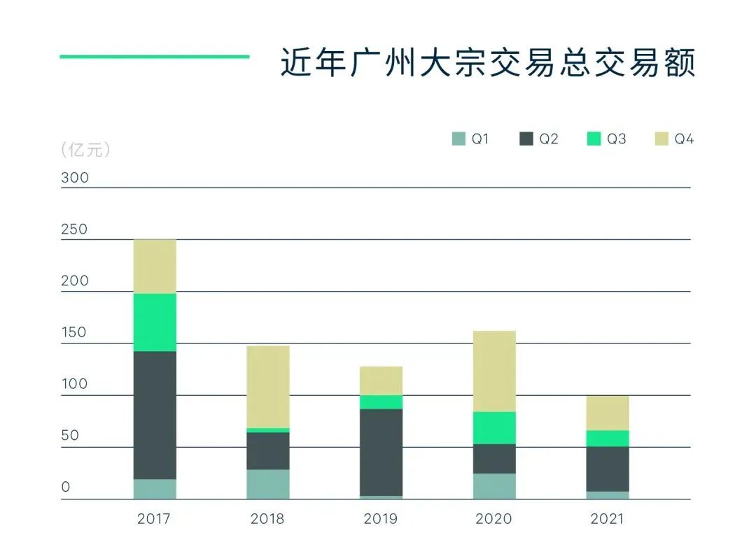 據(jù)世邦魏理仕數(shù)據(jù)顯示,2021年廣州錄得交易14宗,總成交金額約為102億元人民幣(未統(tǒng)計(jì)關(guān)聯(lián)交易),同比減少38%。