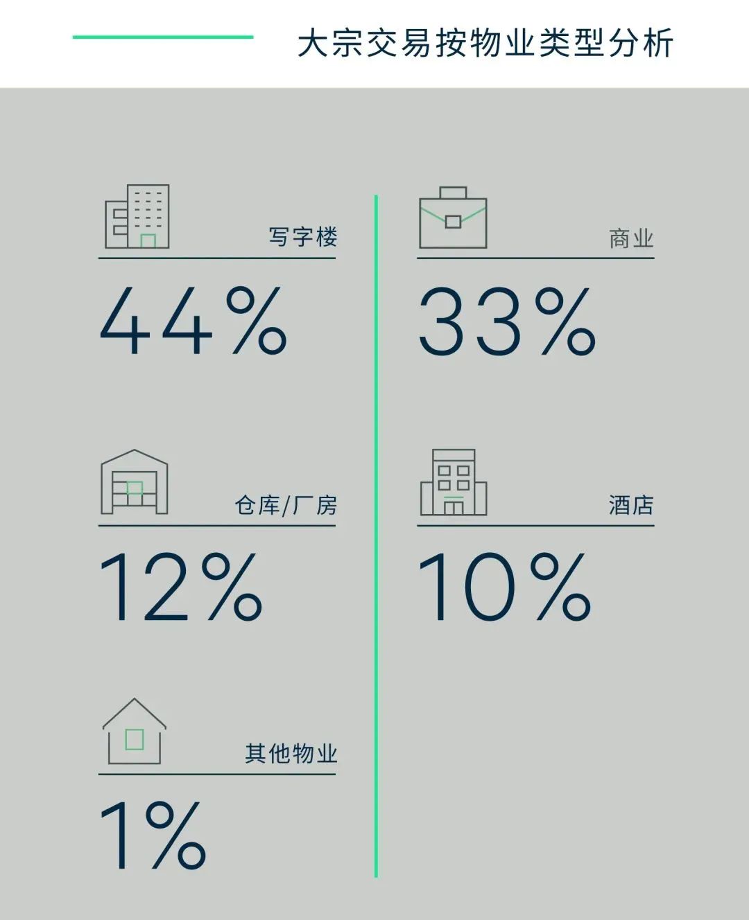 從成交業(yè)類型來看,寫字樓依舊是交易主體,占到總成交量的43%,零售物業(yè)交易上揚(yáng),而產(chǎn)業(yè)物流、數(shù)據(jù)中心的交易額在過去一年實(shí)現(xiàn)快速增長,成交量同比幾乎翻倍,占總成交額31%。