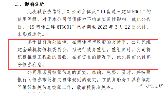 南通三建表示,重組同時其將積極推進工程款的回收,在有資金的情況下,優(yōu)先提前兌付部分債券利息。