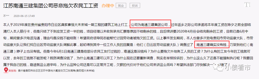 2020年6月,有網(wǎng)友在人民網(wǎng)《領(lǐng)導留言板》向貴陽市委書記反映,南通三建拖欠農(nóng)民工工資。后經(jīng)白云區(qū)人社局協(xié)調(diào),南通三建才將所拖欠9名員工工資全部發(fā)放,共計15.64萬元。