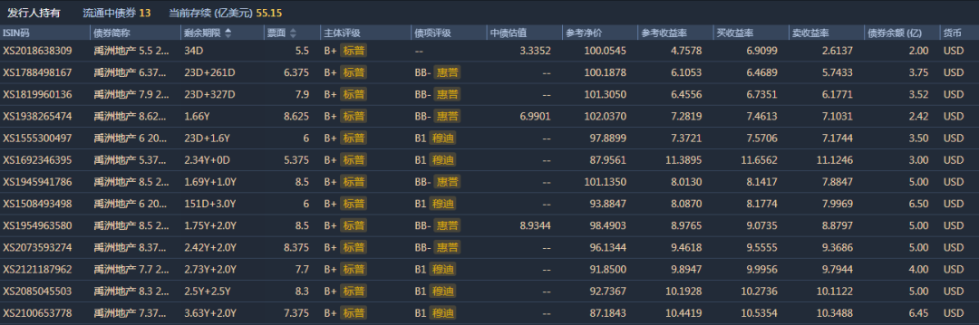 目前,禹洲共有13筆離岸債券,當前存續(xù)55.15億美元,今年有1筆余額為2億美元的離岸債到期。