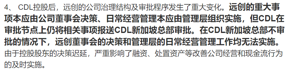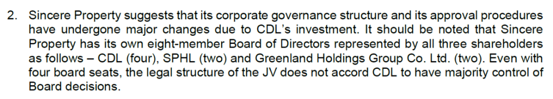 但是CDL對(duì)此并不買(mǎi)賬,針對(duì)協(xié)信遠(yuǎn)創(chuàng)的聲明進(jìn)行反駁,表示其對(duì)CDL的指責(zé)均為不實(shí),大致意思為協(xié)信遠(yuǎn)創(chuàng)董事會(huì)共有8人,協(xié)信和綠地各有2個(gè)名額,CDL所占據(jù)的4個(gè)董事會(huì)席位,不會(huì)對(duì)協(xié)信遠(yuǎn)創(chuàng)構(gòu)成控制。