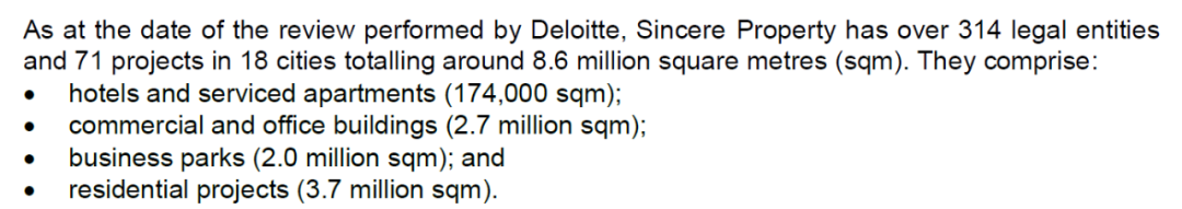殊不知,協(xié)信遠(yuǎn)創(chuàng)的資產(chǎn)結(jié)構(gòu)非常重,根據(jù)事后CDL委派德勤會(huì)計(jì)師事務(wù)所對(duì)協(xié)信遠(yuǎn)創(chuàng)的全面審計(jì),協(xié)信在全國(guó)18個(gè)城市的71個(gè)項(xiàng)目,總計(jì)還有860萬(wàn)平米的可售或自持面積,其中住宅只有360萬(wàn)平米,不到45%,其余為酒店或服務(wù)式公寓、商場(chǎng)、寫(xiě)字樓以及科技園區(qū)等。