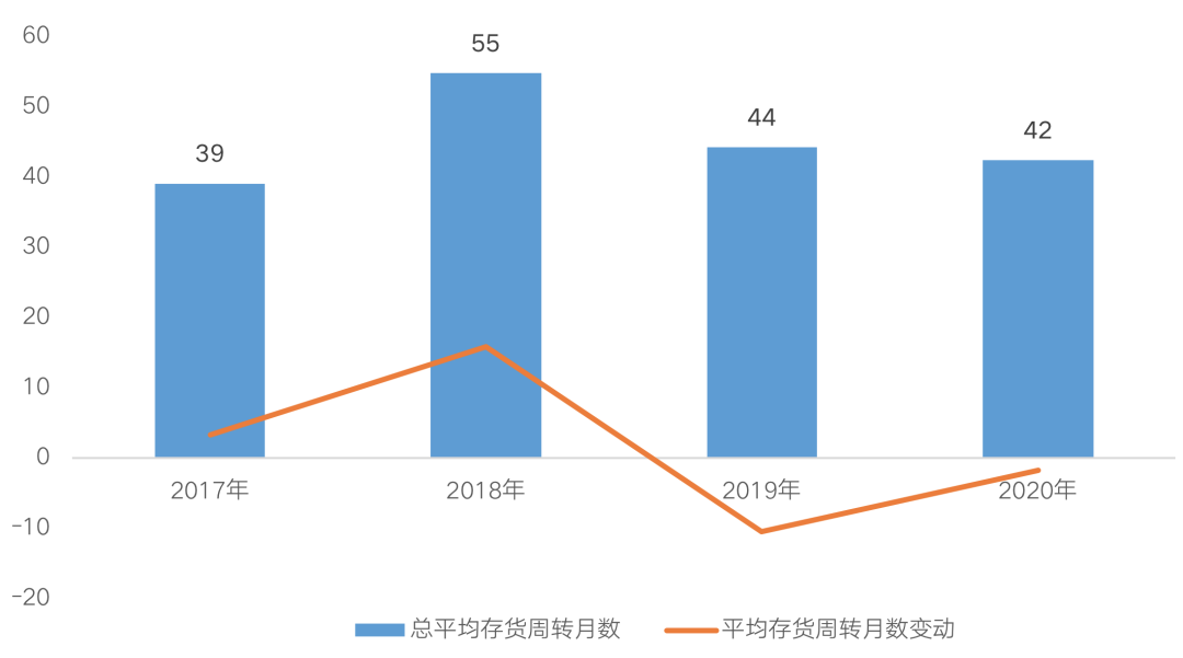 2019年房企增長速度明顯放緩,市場整體去化承壓,行業(yè)視角回歸至去庫存。2020年,突遇新冠疫情,開工與施工進(jìn)度被推遲,隨著經(jīng)濟(jì)秩序逐漸恢復(fù),下半年以來房企積極趕工,全年存貨周轉(zhuǎn)天數(shù)較2019年進(jìn)一步縮短,平均存貨周轉(zhuǎn)月數(shù)為42個(gè)月(約3.5年),較上年下降1.8個(gè)月(約54天)。