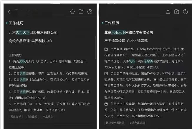 上述用戶的共同點(diǎn)在于,大量huobi global工作人員在北京火幣天下網(wǎng)絡(luò)科技有限公司入職,期間涉及多個(gè)部門,工作內(nèi)容也都涉及到實(shí)際業(yè)務(wù)運(yùn)營,還包括不同部門之間的對(duì)接協(xié)調(diào)。