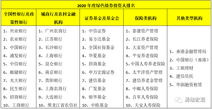2021年1月12日,交易商協(xié)會(huì)在其官方微信號(hào)上公示了2020年度綠色債券投資人排名(根據(jù)投資人參與綠色債務(wù)融資工具的投資程度)。可以看出,全國性銀行中興業(yè)銀行、農(nóng)業(yè)銀行、中國銀行、浦發(fā)銀行和中信銀行排名前五,城商行及農(nóng)村金融機(jī)構(gòu)中廣州農(nóng)商行、江蘇銀行、長沙銀行、上海銀行和昆侖銀行位居前五,其它如理財(cái)公司等亦有參與。