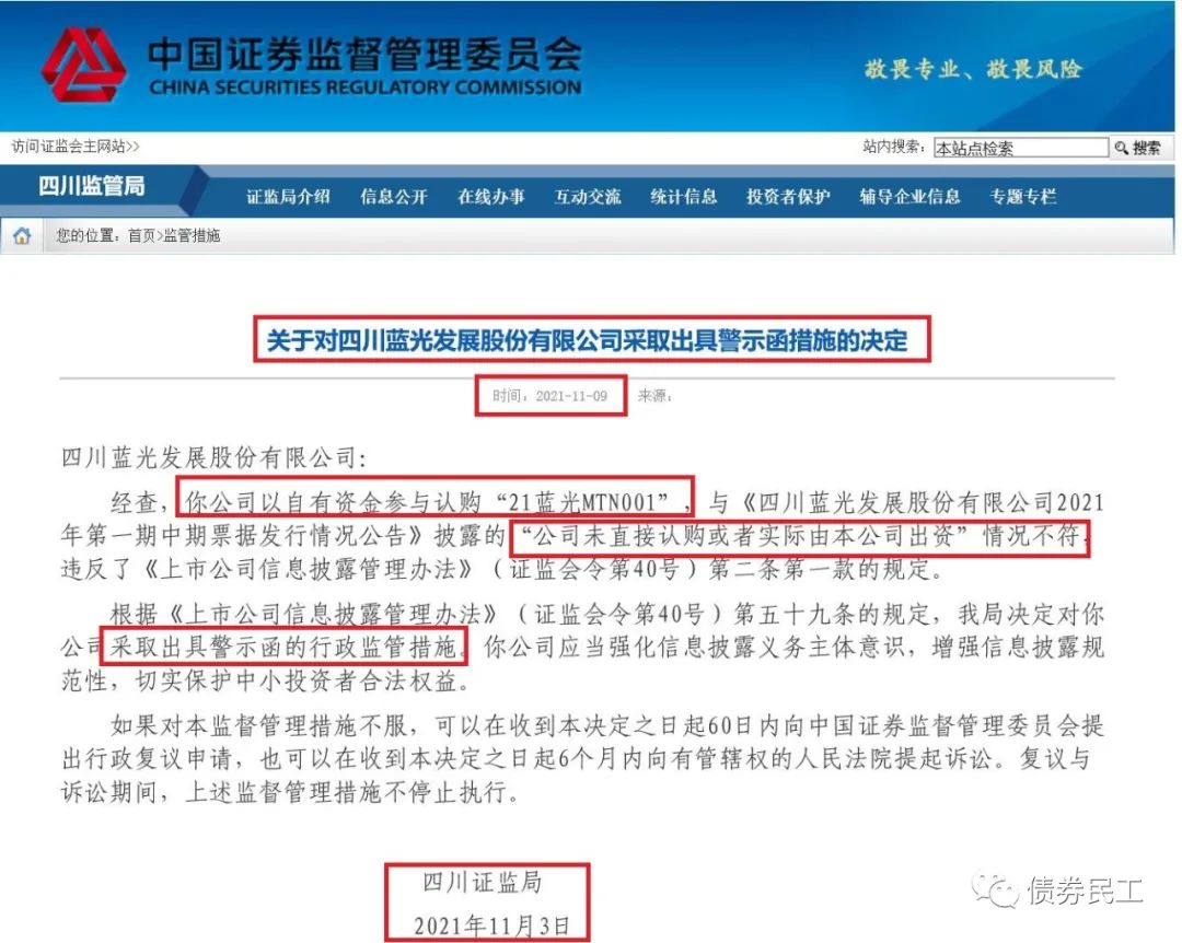 根據(jù)中國證監(jiān)會四川監(jiān)管局披露的信息,四川藍光發(fā)展股份有限公司(以下簡稱“藍光發(fā)展”)因以自有資金參與認購“21藍光MTN001”,被采取出具警示函的行政監(jiān)管措施。這份監(jiān)管措施的落款日期是2021年11月3日,公開披露日期是2021年11月9日。