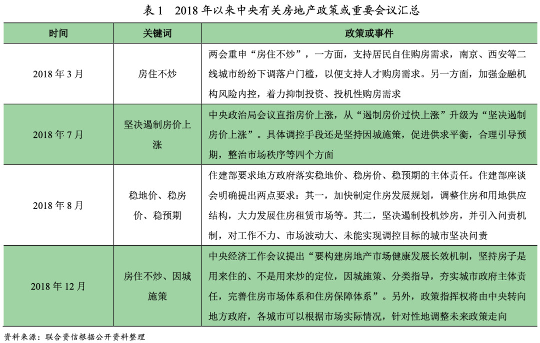 中央層面,自2016年“十一”地產(chǎn)調(diào)控政策周期開(kāi)始,2016年12月的中央經(jīng)濟(jì)工作會(huì)議首提房住不炒,2017年3月地產(chǎn)調(diào)控政策進(jìn)一步升級(jí),呈現(xiàn)了熱點(diǎn)城市政策出臺(tái)高頻次、調(diào)控城市覆蓋范圍廣、政策措施多維度等特征。2018年,在金融財(cái)政政策定向“寬松”的同時(shí),房地產(chǎn)調(diào)控政策仍然“從緊”,繼續(xù)堅(jiān)持“住房不炒”、逐步建立穩(wěn)定房地產(chǎn)市場(chǎng)長(zhǎng)效機(jī)制的調(diào)控思路,具體內(nèi)容詳見(jiàn)表1。