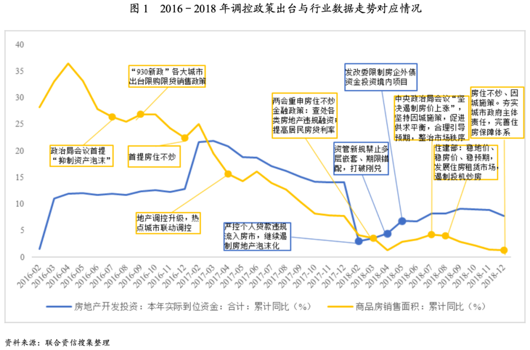 自2016年下半年開(kāi)始,房地產(chǎn)行業(yè)銷(xiāo)售數(shù)據(jù)與需求端的調(diào)控政策緊密相關(guān),隨著調(diào)控的頻繁出臺(tái)銷(xiāo)售數(shù)據(jù)呈明顯下滑且自2018年開(kāi)始持續(xù)地位徘徊;房地產(chǎn)開(kāi)發(fā)投資本年實(shí)際到位資金與融資端/個(gè)人貸款端政策關(guān)聯(lián)度高,2018年初開(kāi)始呈現(xiàn)斷崖式下滑,具體政策時(shí)點(diǎn)與行業(yè)數(shù)據(jù)走勢(shì)對(duì)應(yīng)情況如圖1所示,第一波行業(yè)加壓正式來(lái)臨。