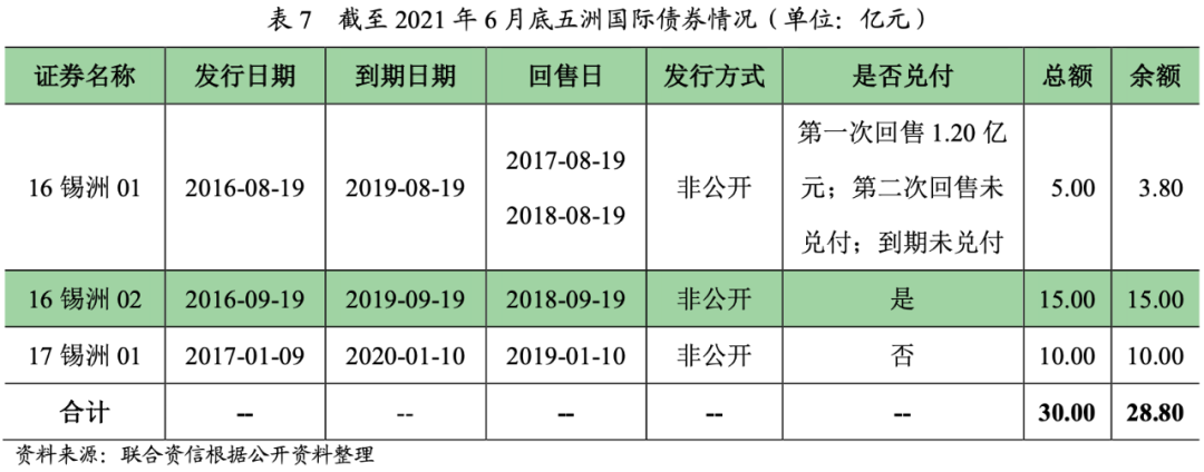 五洲國(guó)際以商業(yè)地產(chǎn)開(kāi)發(fā)為主業(yè),電商的快速發(fā)展對(duì)商貿(mào)城業(yè)務(wù)模式形成明顯沖擊、房地產(chǎn)行業(yè)政策持續(xù)收緊亦使其外部環(huán)境惡化;項(xiàng)目區(qū)域分布較差及項(xiàng)目自身開(kāi)發(fā)周期長(zhǎng)使得去化放緩,經(jīng)營(yíng)性現(xiàn)金流持續(xù)為凈流出;疊加承債式發(fā)展使得債務(wù)規(guī)模持續(xù)增長(zhǎng)且短期債務(wù)規(guī)模較大,資金鏈緊張,最終導(dǎo)致債務(wù)違約。“16錫洲01”未于2018年8月19日償付回售的本金和利息,五洲國(guó)際構(gòu)成了實(shí)質(zhì)性違約,其后15億元的“16錫洲02”和10億元“17錫洲01”相繼違約,截至2021年6月底,五洲國(guó)際違約金額共計(jì)28.80億元。