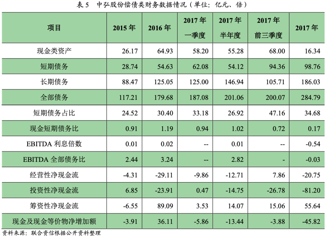 中弘股份在建及擬建項(xiàng)目主要為商住及文旅項(xiàng)目,去化速度較慢且受政策影響較大,受北京商辦類(lèi)項(xiàng)目及海口填圍海項(xiàng)目政策收緊影響,中弘股份京內(nèi)商住項(xiàng)目及海南如意島等項(xiàng)目銷(xiāo)售停滯;疊加中弘股份因經(jīng)營(yíng)不善致使山東及浙江等地的多個(gè)項(xiàng)目處于停工狀態(tài),2017年以來(lái)銷(xiāo)售額大幅下滑,經(jīng)營(yíng)性現(xiàn)金流對(duì)業(yè)務(wù)支撐不足。受銷(xiāo)售大幅下降影響,中弘股份現(xiàn)金類(lèi)資產(chǎn)大幅下滑且現(xiàn)金短期債務(wù)比處于極低水平,中弘股份的資金鏈已經(jīng)極其緊張。